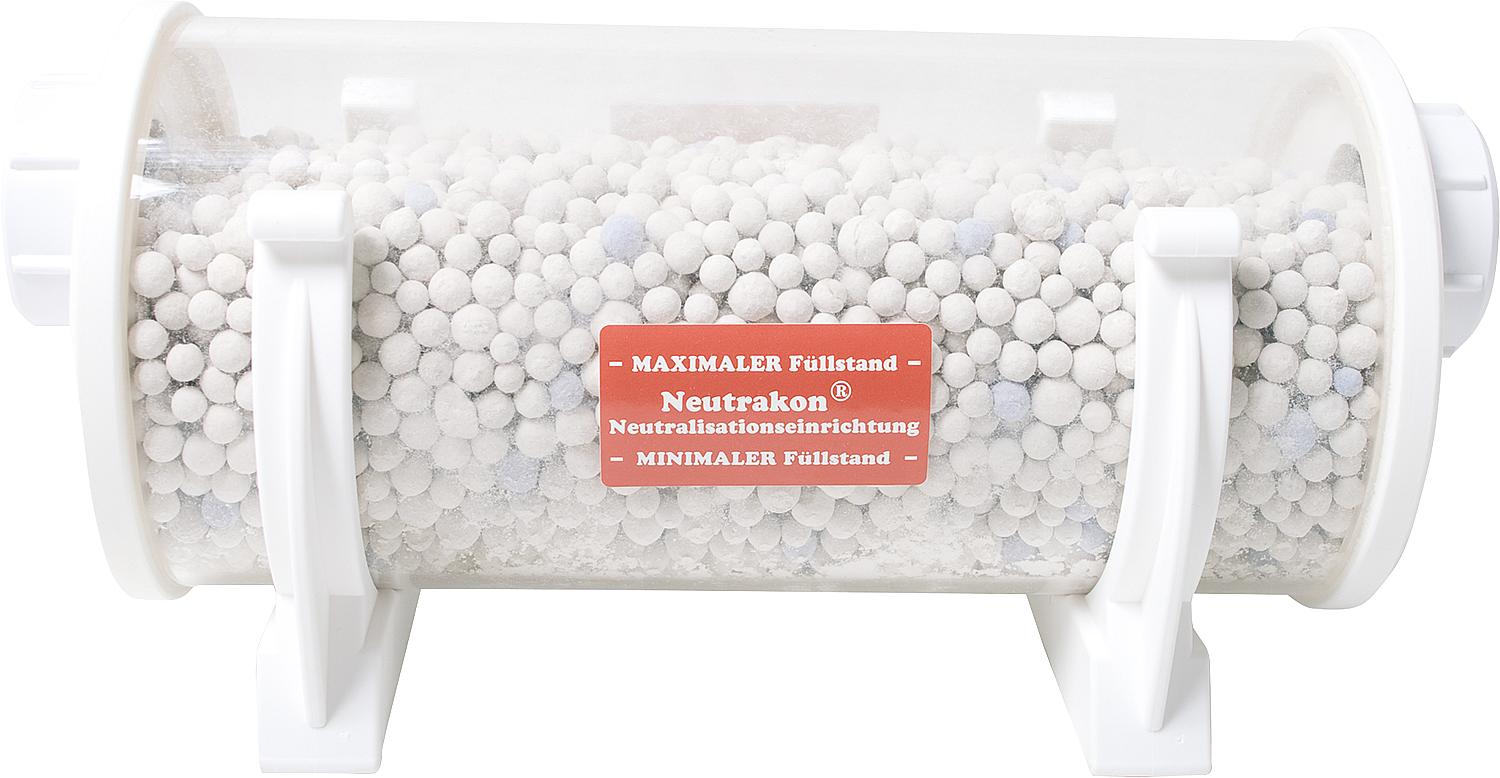 Includes neutralizing granules for initial filling. The granules empty themselves automatically, and the fill level is clearly visible through the clear filter housing. The device requires minimal maintenance and needs refilling at most once a year.