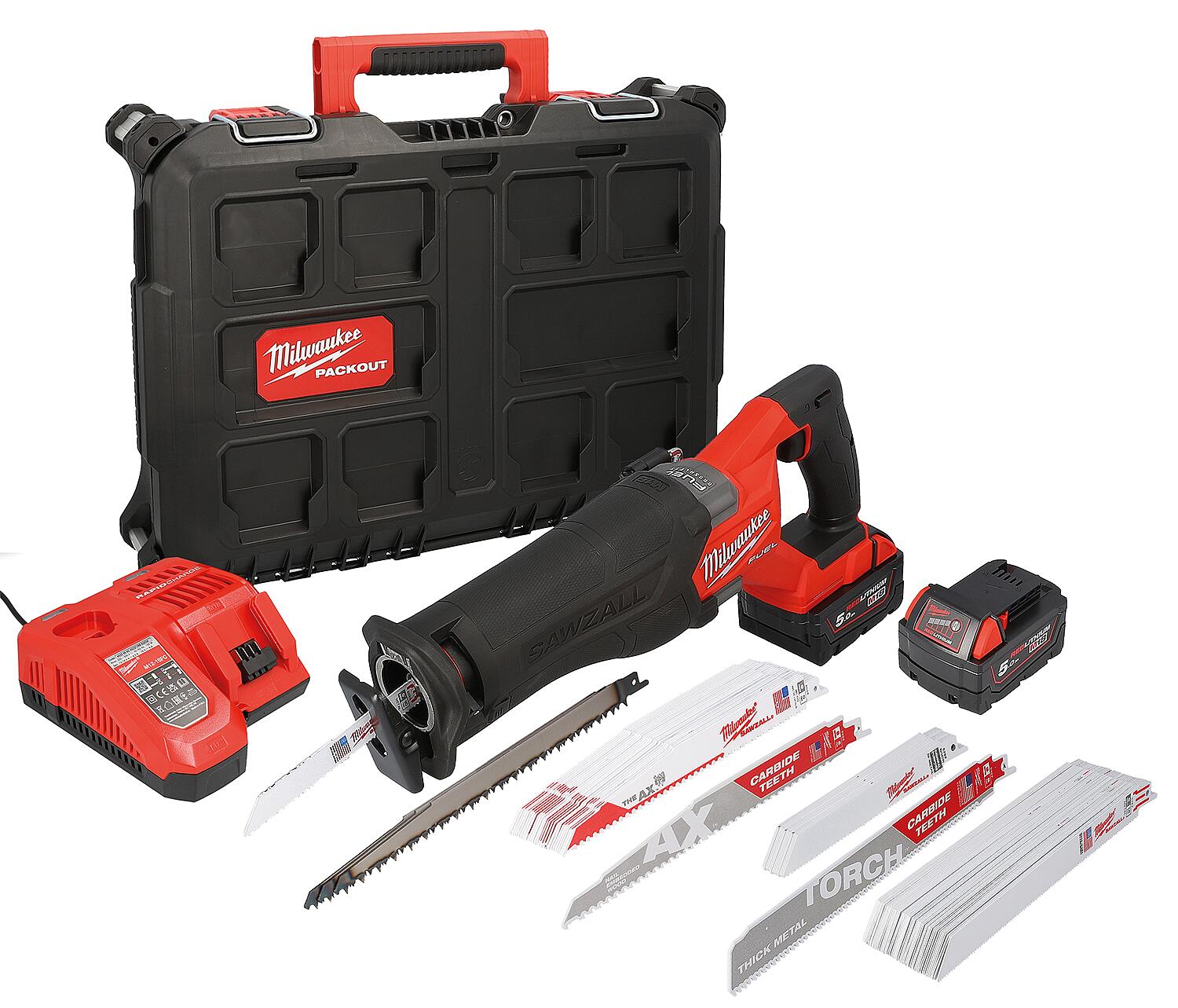 Scie alternative sans fil Milwaukee M18 FSZ100P-502P 18V avec 2 batteries de 5,0 Ah, chargeur et étui de transport comprenant 95 lames de scie alternative