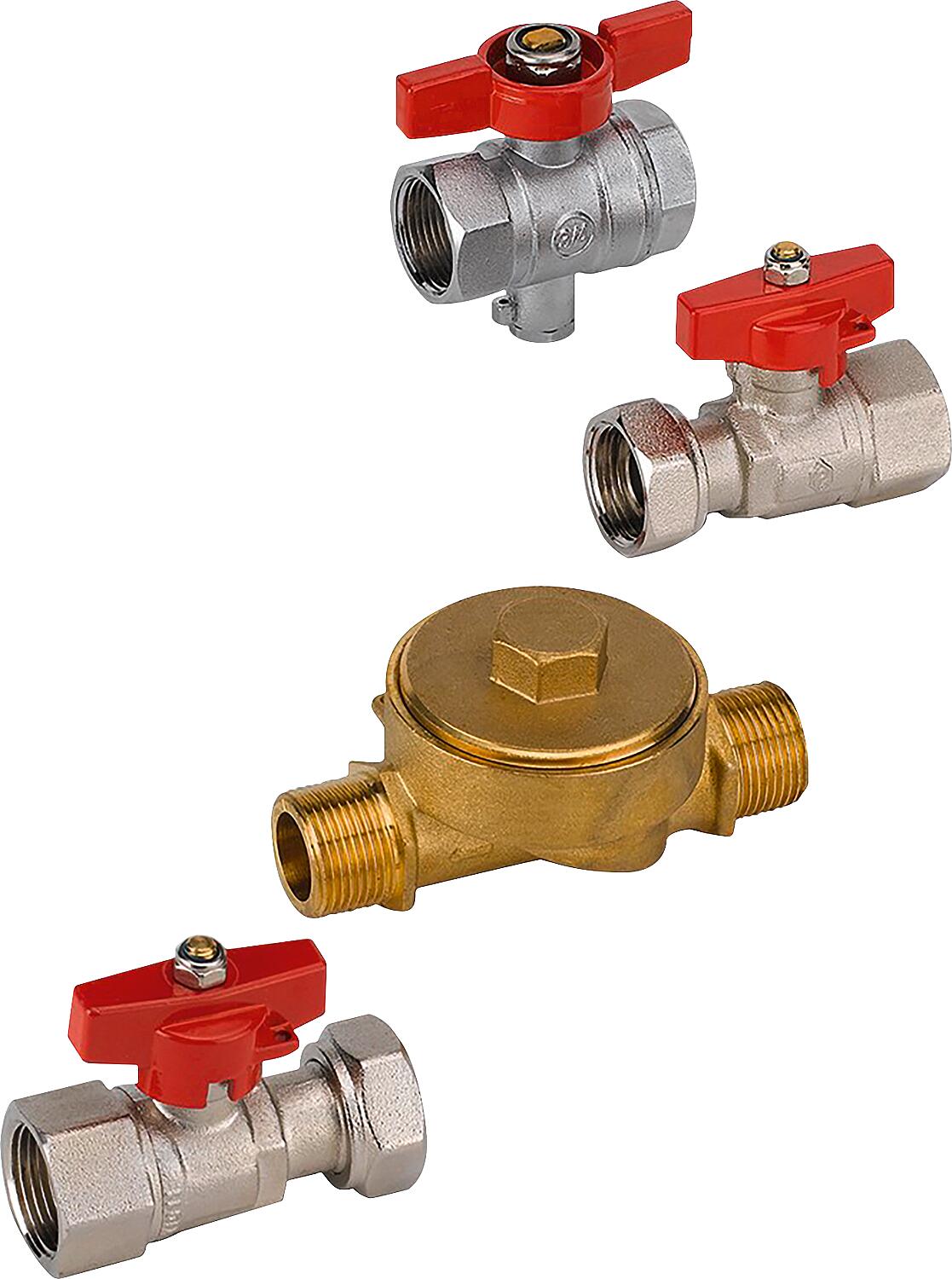 Einbausatz für Wärmezähler - Koax, bestend aus 1 Kugelhahn mit Messondenanschluss, 2 Kugelhahn ohne Messondenanschluss, 1UP-Gehäus